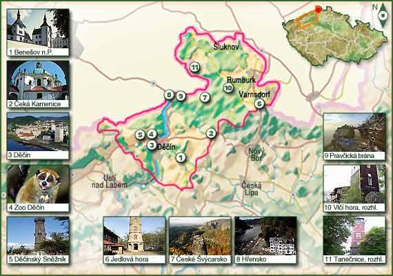 Této oblasti dalo jméno město na Labi a šňůra hor, která se táhne při česko-německých hranicích od Ještědského hřebenu až po Šluknovský výběžek. Rytmus života tu určují především protáhlé hřbety Lužických hor. Oblíbená letoviska, klimatické lázně, turistické chaty, výletní hostince i staré kamenné rozhledny prozrazují předlouhé tradice zdejší výletní oblasti a pěším turistům i cyklistům skýtají bohaté možnosti. Pobyty v Lužických horách jsou příjemné, zvlášť když se vám zdejší kraj odhaluje krok za krokem. Po značených cestách přes vesnice se starými roubenými domy se sedlovými střechami se dostanete například do Jiřetína, kde je malebná zřícenina hradu Tolštejn a také starobylé poutní místo na Křížové hoře s křížovou cestou. Města jako Děčín s půvabným zámkem, vyhlídkovými plavbami po Labi a zoologickou zahradou, historický Varnsdorf či Rumburk s nejseverněji položenou loretou v českých zemích jsou díky své pestrosti dalším krásným zastavením v této oblasti. - Benešov nad Ploučnicí - město s řadou historických památek. Zámek ve stylu saské renesance, interiéry s dekorativní výzdobou stěn a malovanými renesančními stropy. Sbírky nábytku a porcelánu, expozice Dálného východu. - Česká Kamenice - historické město s barokní poutní kaplí Narození Panny Marie, kruhová křížová cesta. Nad městem zříceniny gotického hradu s vyhlídkovou věží. - Děčín - dominantou města zámek, v prostorách bývalé zámecké Thunovské zbrojnice muzeum loutek. Ojedinělá barokní tzv. Dlouhá jízda, téměř 300 m dlouhá příjezdová cesta k zámku, obehnaná vysokými zdmi se slepými arkádami. - ZOO Děčín - areál na Pastýřské stěně, dřevěné plastiky zvířat, místa na skákání, lezení a hraní, opičí stezky, prolézačky a houpací lávky, velký model hry Člověče nezlob se, dětská ZOO. - Děčínský Sněžník - na nejvyšším bodě děčínských stěn (723 m) vznikla v roce 1864 kamenná rozhledna s cimbuřím, jedna z nejstarších a nejkrásnějších vyhlídkových věží v Čechách. - Jedlová Hora - třetí nejvyšší vrchol Lužických hor (774 m). Kamenná rozhledna z roku 1891 s mimořádným výhledem na Krkonoše, Krušné hory, Český ráj a České středohoří. Restaurace a pomník německého básníka F. Schillera. - Národní park České Švýcarsko - unikátní pískovcové skalní město, součást rozsáhlejšího celku Labské pískovce. Známá výletní oblast pro všechny obdivovatele přírody, turisty i horolezce, síť značených cest, naučné stezky. - Hřensko - nejznámější obec v oblasti Labských pískovců. Atraktivní plavby na pramicích soutěskami řek Tiché a Divoké Kamenice s mnoha skalními útvary. Vodopád v Edmundově soutěsce, zajímavá skalní kaple. - Rozhledna Belvedér - nejstarší upravená vyhlídka Českého Švýcarska asi 130 metrů nad hladinou Labe. Výhled do hlubokého kaňonu řeky Labe a na stolové hory Zirkelstein a Kaiserkrone na německé straně hranice. - Pravčická brána - největší přirozená skalní brána v Evropě, považovaná za nejkrásnější přírodní útvar Českého Švýcarska, symbol oblasti. Stezky a schodiště na jednotlivé vyhlídky, výletní zámeček Sokolí hnízdo s muzeem a stylovou restaurací. - Rozhledna Vlčí Hora - nejstarší rozhledna ve Šluknovském výběžku na zalesněném kopci nad obcí Vlčí Hora (581 m), výhled na České středohoří, Krušné hory, Jizerské Hory, Ještěd i Polsko. - Rozhledna Tanečnice - rozhledna u obce Mikulášovice na rozložitém zalesněném hřbetu Šluknovské pahorkatiny (598 m), nejseverněji položená vyhlídková stavba v ČR. Z TISKOVÝCH ZPRÁV A ČLÁNKŮ