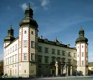 ![]() Zámek Vrchlabí [ Zámek ]![]() Zámek, vybudovaný v letech 1545-1546 Kryštofem z Gendorfu, patří k nejranějším světským stavbám renesančního stavitelství v Čechách. Neznámý stavitel vycházel ze schématu italského kastelu, tj. malé pevnosti nebo tvrze s nárožními věžemi, kde čtyři křídla s obytnými místnostmi obklopovala nádvoří uprostřed. U vrchlabského zámku je nádvoří nahrazeno vstupní halou. Dostavby zámku se účastnil pravděpodobně i významný italský stavitel Carlo Valmadi. Původně jej obklopoval 2,5 m široký pás zeleně a za ním vodní příkop 12 m široký, který překračovaly tři mosty. Zámek prošel celou řadou stavebních úprav, nejvíce v 2. polovině 19. století a na počátku 20. století. Budovy přiléhající k zámku sloužily dříve k hospodářským účelům. Zámek je dnes sídlem Městského úřadu. Návštěvníci mohou shlédnout pouze vstupní halu s dveřmi zdobenými intarzovanými motivy a obrazy čtyř krkonošských medvědů ulovených na vrchlabském panství v letech 1665, 1693, 1701, 1726. Nejvzácnější památkou zámku jsou renesanční kachlová kamna v bývalém tzv. rytířském sále, jediný předmět, který se dochoval z původního zařízení. Vynikají nejen svou velikostí, ale i výzdobou - představují jedno z prvních užití majoliky v českých zemích. Kachle obsahují biblické náměty a letopočet 1545.